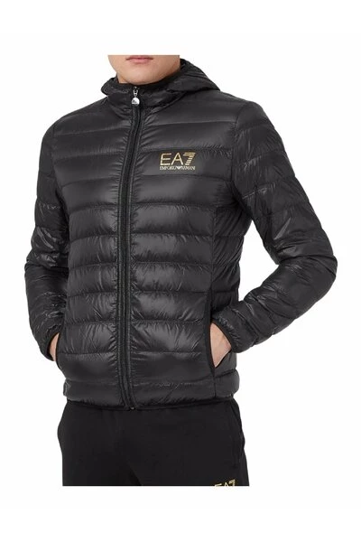 Emporio Armani EA7 – Black Hooded Dekbed het combineren van de lichte duvetvulling met waterafstotende stof om maximaal comfort te garanderen. Het is uitgerust met fullzip-sluiting met gouden logo en zijzakken.Details: – – – afdrukken op de borst – Twee zakken – binnen in eendenveer- twee zakken- stretch manchetten