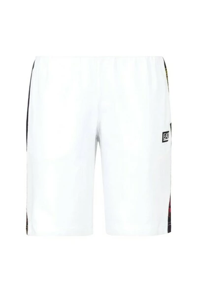 EA7 Emporio Armani Bermuda in wit katoen voor heren met twee zakken aan de voorkant. Ernstige zwarte rubberen plaat met contrastlogo aan de voorkant. Laterale banden in zwarte tape volledig veelkleurig logo. Bermuda met Coulisse Al Vita.