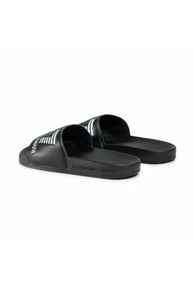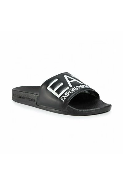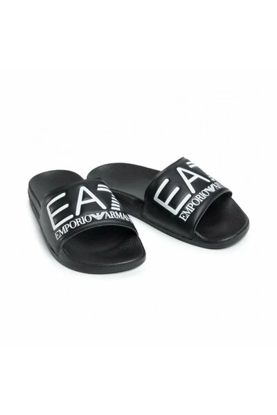 Muilezels met groot logo – EA7. Tonen: zwarten. Materiaal: PVC. Tip: neem uw gebruikelijke maat. Talon: Dish. Bout: Round. Logo: ingelegd. Boven/staaf: synthetisch. Model: platte schoenen.